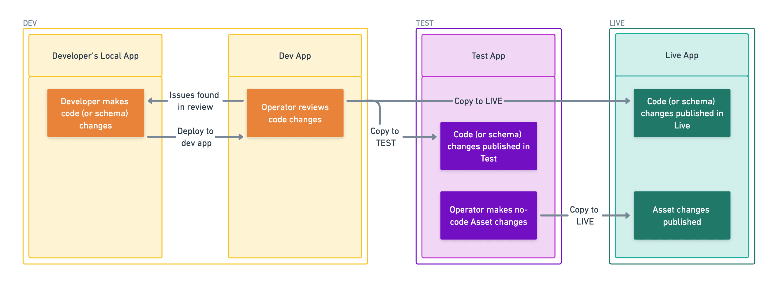 The operator can make no-code changes in Test, and copy them to Live without needing the developer to intervene. Because Test and Live are identical, the operator can trust that their changes made in Test show up correctly when published to Live.