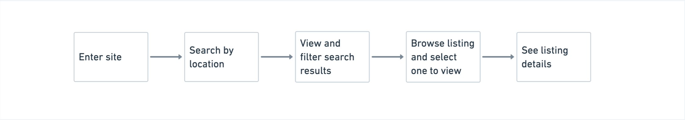 The search journey defines how users search and find listings in your marketplace. Starting on the landing page, users progressively narrow their search to find the service, rental, or product they need. Users might find what they need by searching nearby locations or via keywords. Results should be filtered by relevant criteria, like price or category.